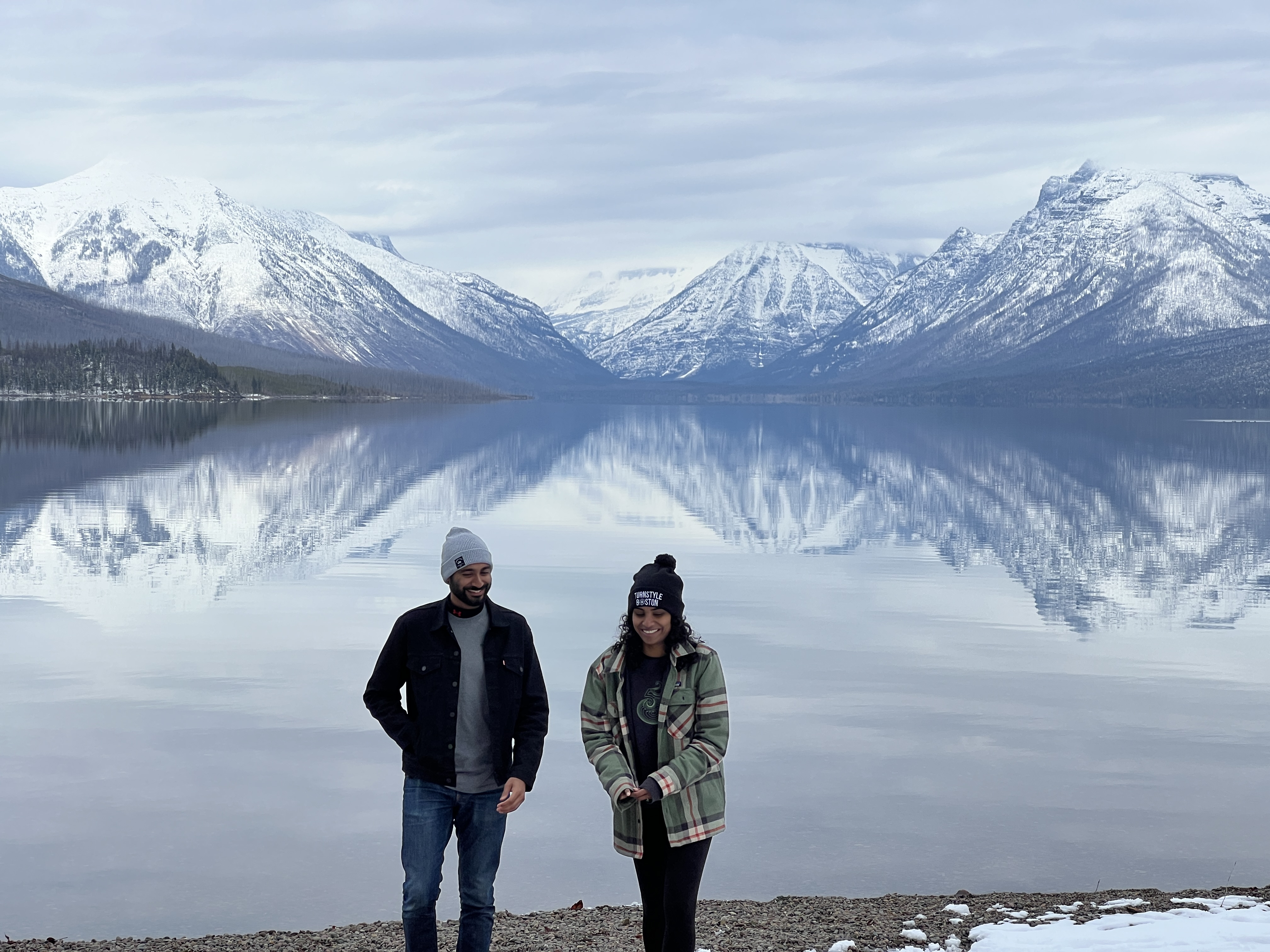 Those are the mountains behind lake mcdonald at glacier national park where shreyas proposed to aniksha. it was 25 degrees out, so she said yes in a hurry.